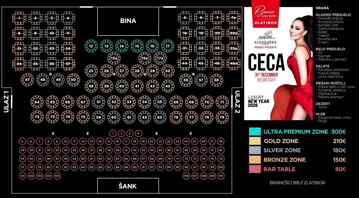 Svečana sala Pjević Event Centar je luksuzno i moderno uređen prostor koji odiše elegancijom i izdvaja se po vrhunskom kvalitetu ponude i usluge. U najluđoj noći, za doček 2026. godine zabavljaće vas fantastična Ceca koja obećava vrhunski muzičko scenski spektakl.